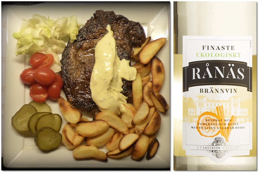 En bit entrecote hamnade i stekpannan idag,i ugnen har jag potatisklyftor på G..Laddar tallriken med lite isbergs,minitomat och saltgurka..Steker ca 1,5 min på varje sida,brukar bli medium+,perfekt för min smak.Med lite beasås så är det fullkomnat..Laddar med en 5 cl snaps också en Rånäs,som ingår i boxen Svenska Nubbar,kommer bli bra.