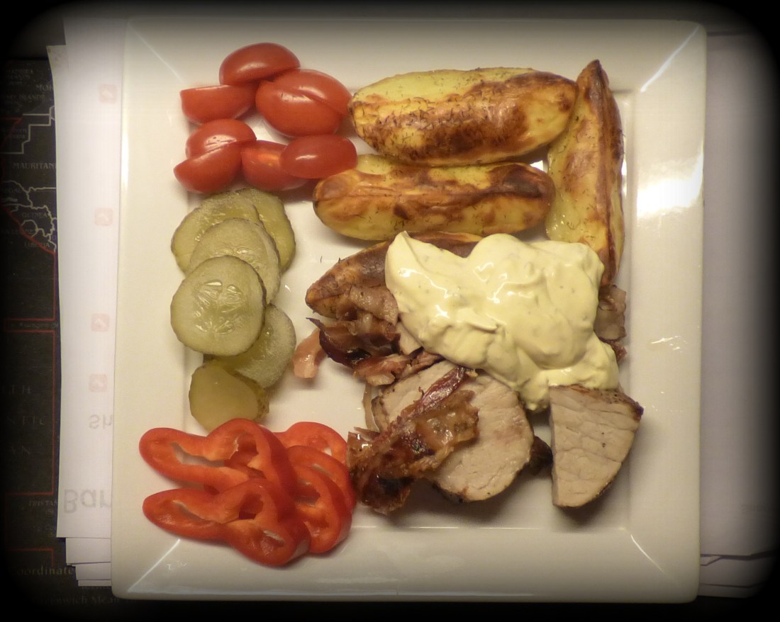 Ja det blev den sista lådan med den baconlindade fläskfilén,även denna gång med potatisklyftor bea och lite grönt.Tomat,gurka,paprika.Blev en snaps också en 5:a Herrgårdsakvavit,mumsigt vill jag lova..