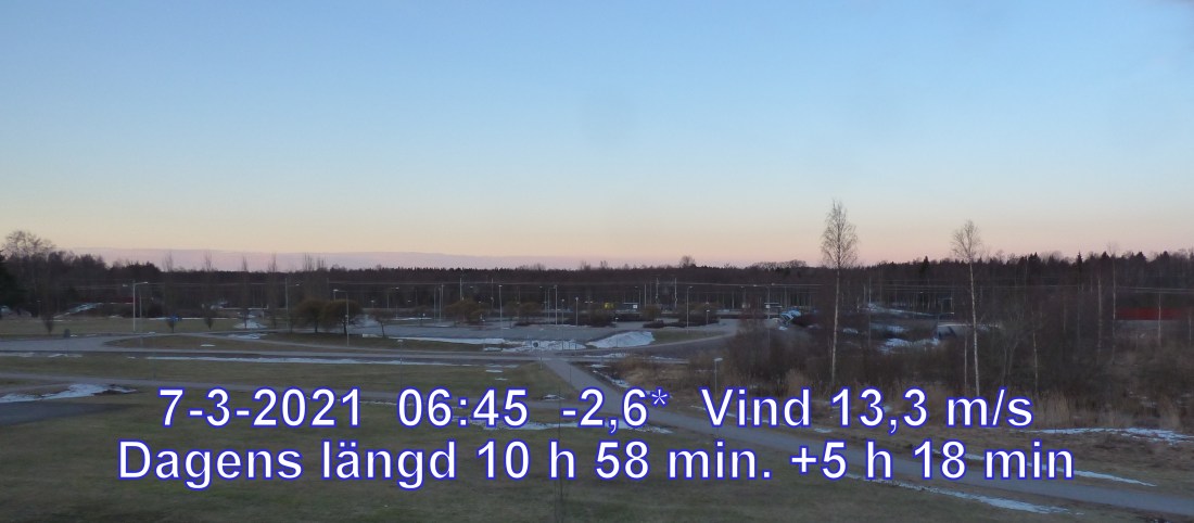 -2 °C Vind 13,3 m/s Soluppgång 06:33 Solnedgång 17:31 Dagens längd 10 h 58 min.
