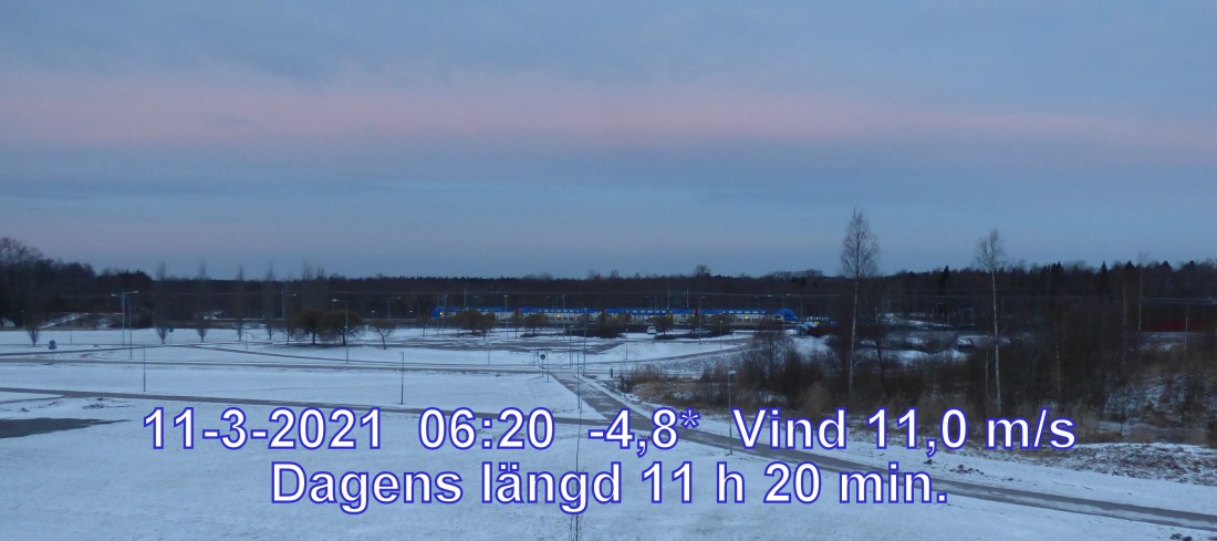 -4 °C Vind 11,0 m/s Soluppgång 06:21 Solnedgång 17:41 Dagens längd 11 h 20 min.
