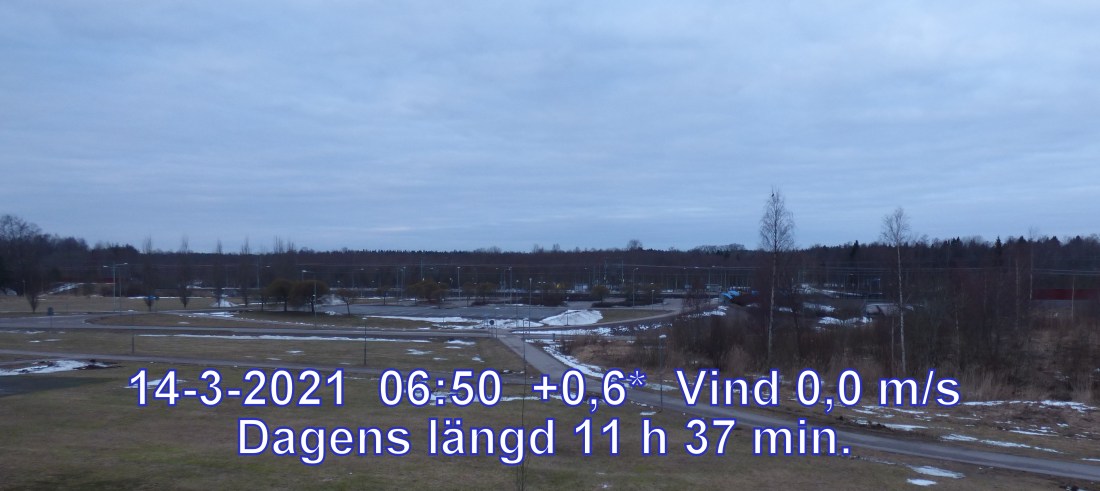 +1 °C Vind 0,0 m/s Soluppgång 06:11 Solnedgång 17:48 Dagens längd 11 h 37 min.