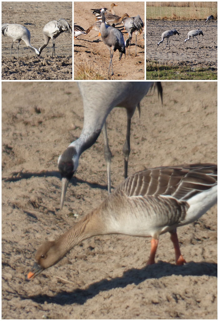 Tidigt i morse körde jag ner till slätten,ganska många Tranor utspridda på tre fält,gjorde ett överslag var nog ca 125 st,det såg ut som Tranor och Grågås kom väl överens där dom tillsammans sökte efter något ätbart i myllan.