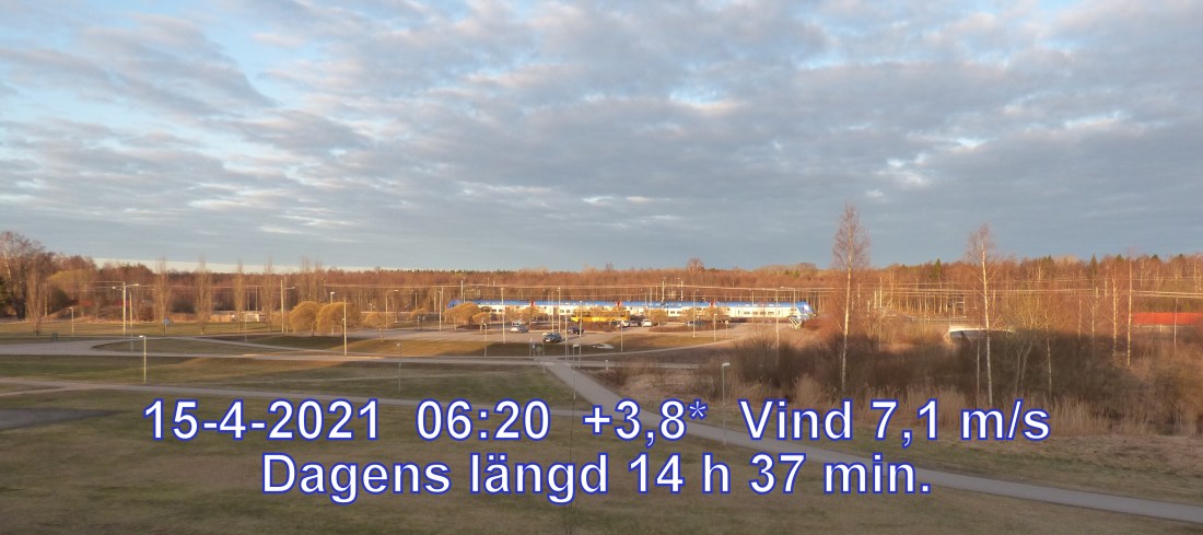 +4 °C Vind 7,1 m/s Klart och uppehållsväder Soluppgång 05:32 Solnedgång 20:09 Dagens längd 14 h 37 min.