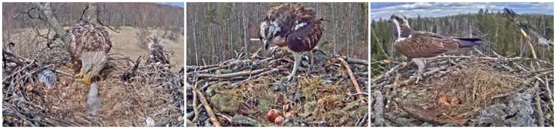 Hos Havsörnen är nu båda äggen kläckta,så matbestyren är nu igång..Gjusen i bo-1 var borta från de 3 äggen i boet i ca 8 min..I Gjuse bo-2 var det skiftbyte,även där finns det 3 st ägg..