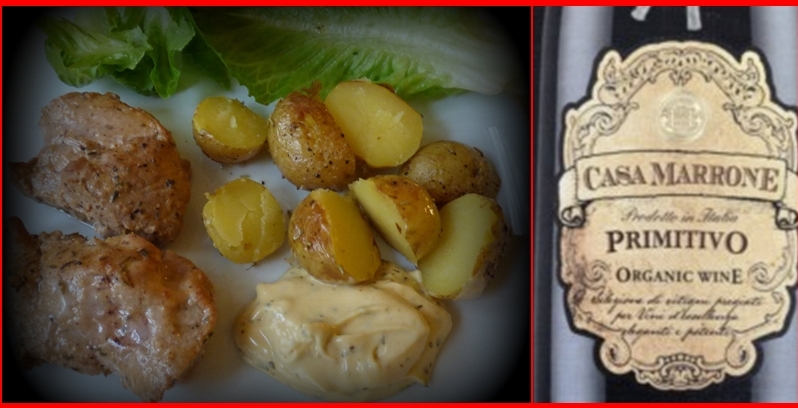 Idag bjöd sonen på fläskfilé och potatis i ugnen,lite grönt och en jättegod grillbea..I glaset en mycket god Italienare Casa Marrone,,kanonvin.