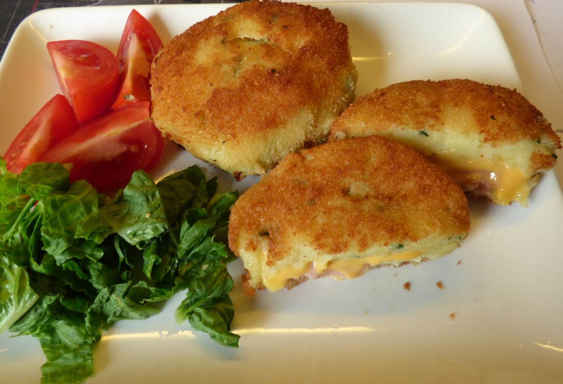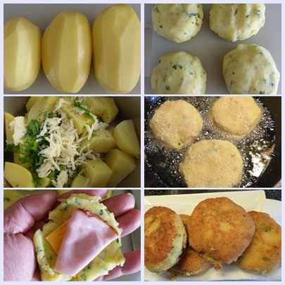 Koka skalad potatis,hacka ner lite persilja lägg i lite riven mozzarella,stampa till mos.Lägg mos i handen lägg på ost och skinka,lite mer mos ovanpå,forma till en bulle.Panera i ägg och ströbröd..Jag hade i ca 2,5 dl solrosolja i stekpannan..Bullarna fick sedan gå i till fin färg på båda sidorna.. Ganska enkel matlagning.