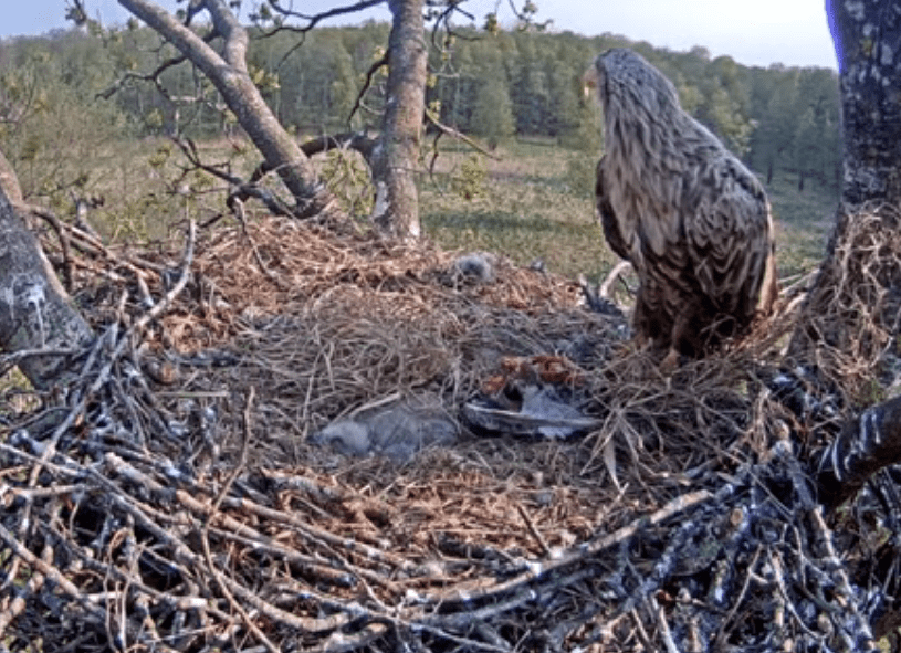 När jag kollade idag på förmiddagen så var även den andra ungen livlös och någon timme senare syntes inte ett spår av något liv i boet..Mamma Örn lämnade boet kl 11 på fm och har inte återkommit dit än kl nu 14:20.Sorgligt.