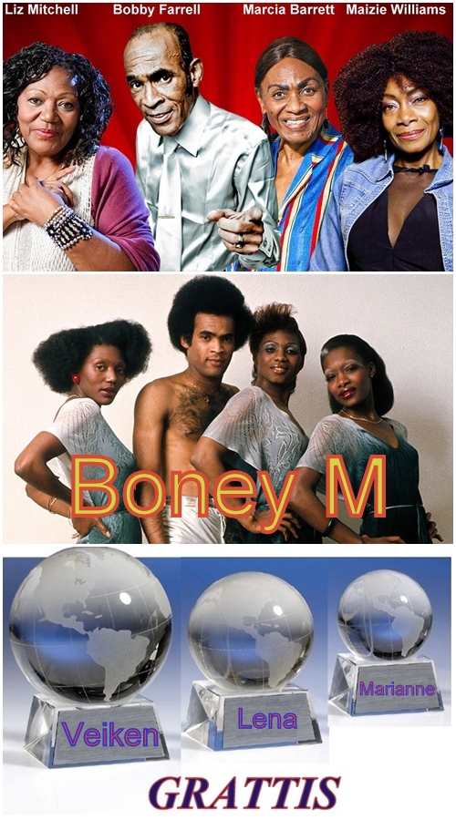 Det blev ..Boney M.En tysk popgrupp inom discogenren som hade sin storhetstid under sent 1970-tal och tidigt 1980-tal. Gruppen bildades 1975 av musikproducenten Frank Farian, men då utan medlemmar. Farian gjorde till en början själv samtliga röster och det tog något år innan riktiga artister möjliggjorde ett live-uppträdande. De fasta medlemmarna under succéåren blev fyra personer av karibisk härkomst: Marcia Barrett, Liz Mitchell, Maizie Williams och Bobby Farrell.