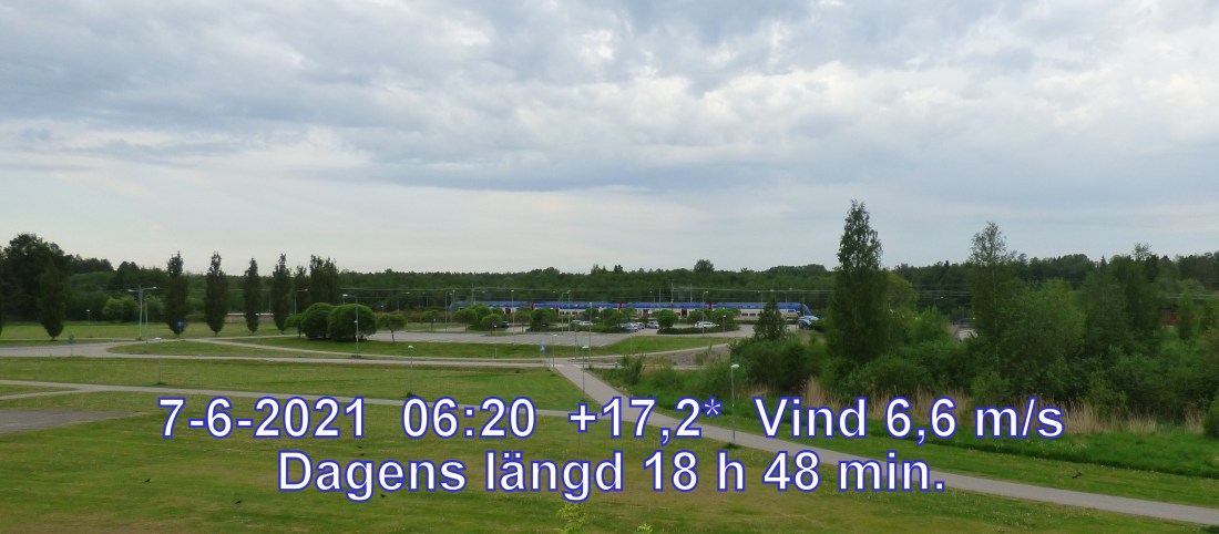 +15 °C Vind 6,6 m/s Halvklart och uppehåll Känns som +14° Fuktighet 92.5% Soluppgång 03:25 Solnedgång 22:13 Dagens längd 18 h 48 min.