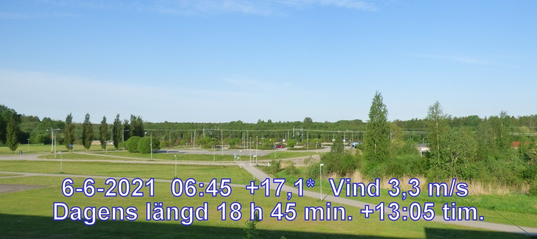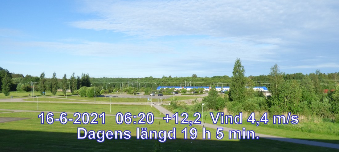 +15 °C Vind 6,6 m/s Halvklart och uppehåll Känns som +14° Fuktighet 92.5% Soluppgång 03:25 Solnedgång 22:13 Dagens längd 18 h 48 min.