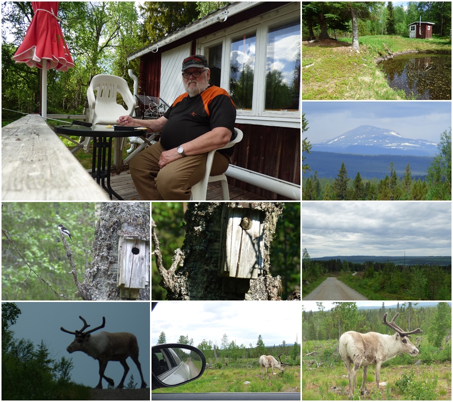 Pustar ut efter 52 mil i baken,lågt vatten i dammen,fick rensa inloppet,fortfarande lite snöfläckar på Borgafjällen,Flugsnapparen har koll,,mamma Snappare kikar ut, vägen utför Knaftarberget ner mot byn,här hade man avverkat en del skog på båda sidor av vägen,renen Rudolf var inte så blyg poserade gärna.