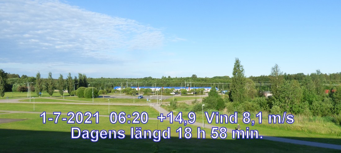 +14 °C Vind 8,1 m/s Klart och uppehållsväder Soluppgång 03:24 Solnedgång 22:22 Dagens längd 18 h 58 min.