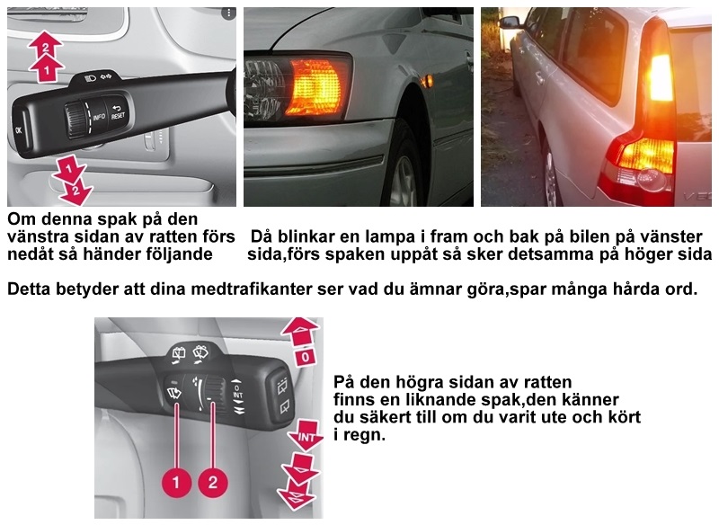 Körde in till stan(Gävle) idag på förmiddagen,hörde Miss Li på radion hon sjöng sin nya låt ”Instruktionsboken”.Då slog det mig att hon är ju inte ensam om att inte hitta den.Detsamma gäller ju ett stort antal av mina medtrafikanter,oavsett bilmärke verkar det som att Instruktionsboken inte är funnen..Därför lägger jag ut ett klargörande här.På rattstången finns 2 viktiga spakar 1 till vänster 1 till höger.Den till vänster är viktig,genom att använda den visar du oss,dina medtrafikantervad du ämnar göra..Den till höger har du säkert kommit underfund med om du kört i regnväder.