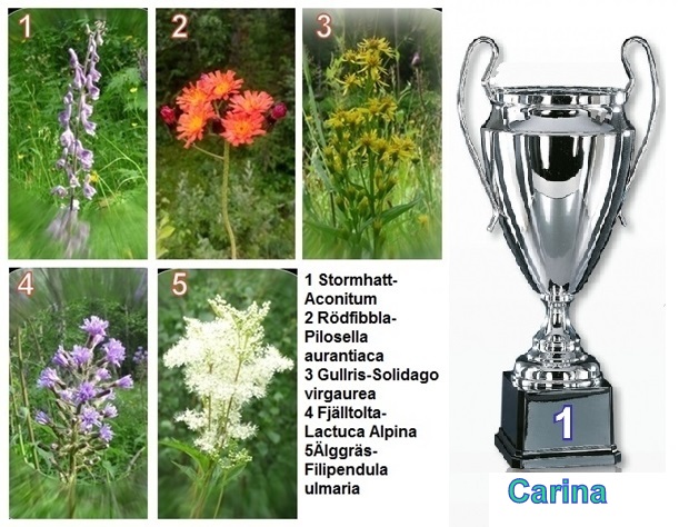 Grattis Carina,du hade svarat,1. Stormhatt 2. Rödfibbla 3. Gullris 4. Torta 5. Astilbe…Nr 5 var Älggräs..