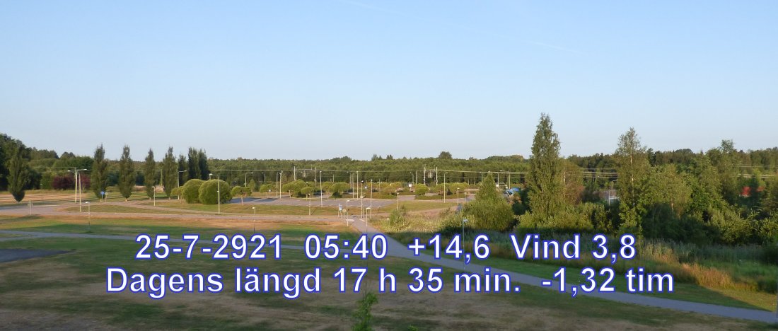 +18 °C Vind 3,8 m/s Klart och uppehållsväder Känns som+17° Daggpunkt+14° Fuktighet 78.9% Soluppgång 04:08 Solnedgång 21:43 Dagens längd 17 h 35 min.
