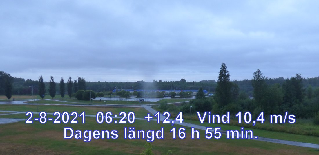 +15 °C Vind 10,4 m/s Känns som +12° Fuktighet 89.5% Soluppgång 04:28 Solnedgång 21:23 Dagens längd 16 h 55 min.