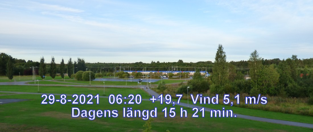 +13 °C Vind 5,1 m/s Halvklart och uppehåll Känns som+11° Daggp +9° Fuktighet 78.7% Soluppgång 05:12 Solnedgång 20:33 Dagens längd 15 h 21 min.