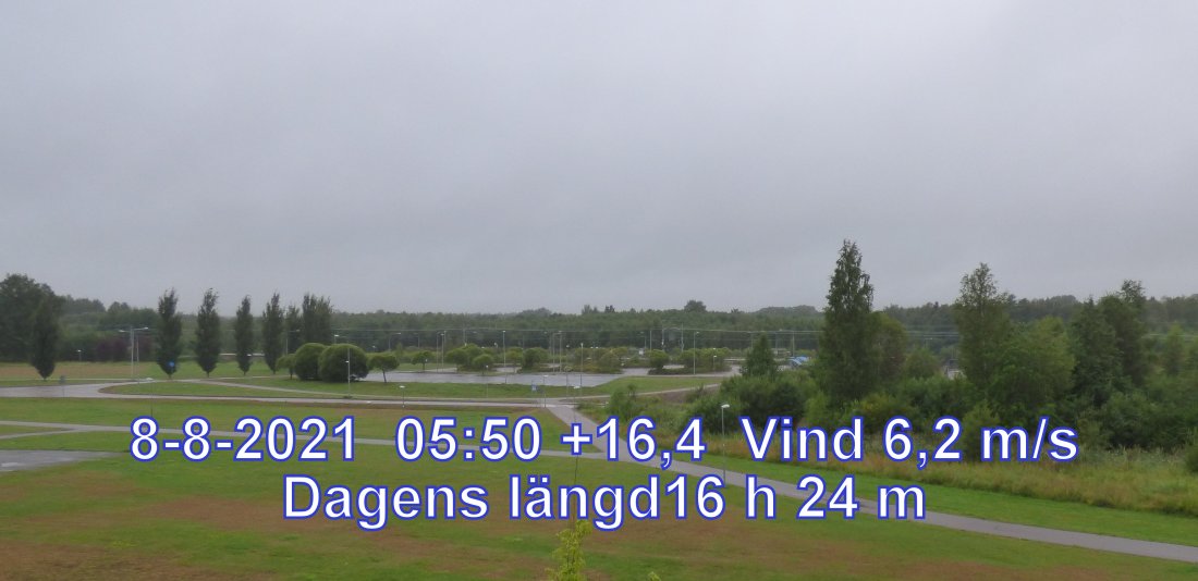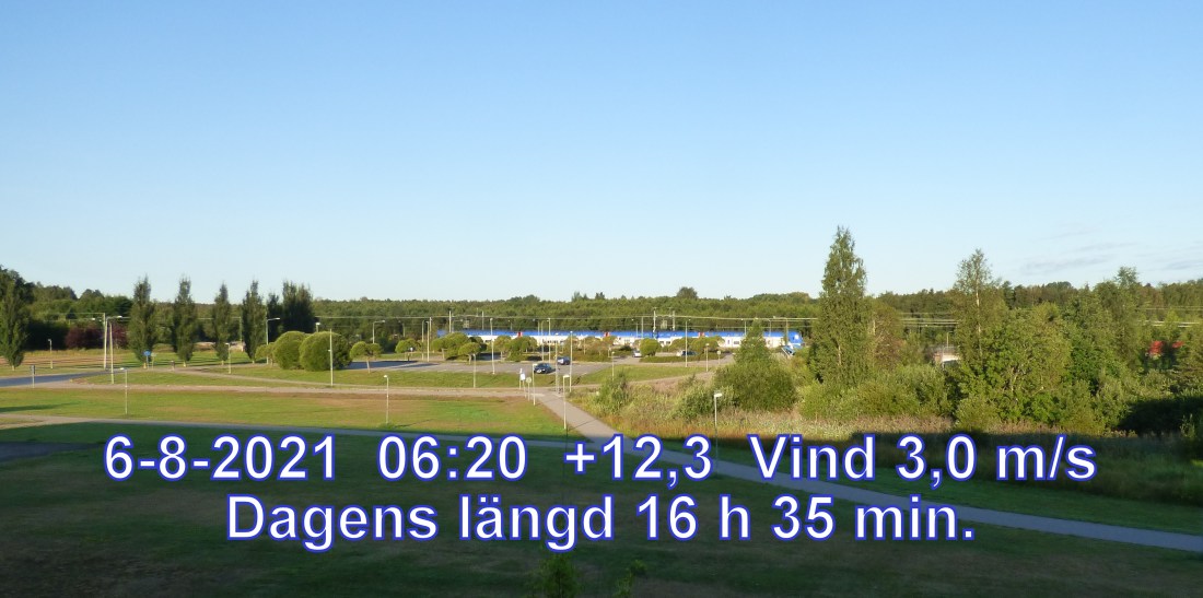+16 °C Vind 4,0 m/s Känns som +15° Daggpunkt +11° Fuktighet 74.6% Soluppgång 04:35 Solnedgång 21:15 Dagens längd 16 h 40 min.