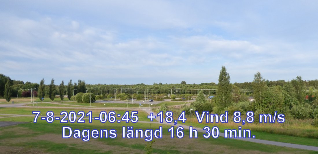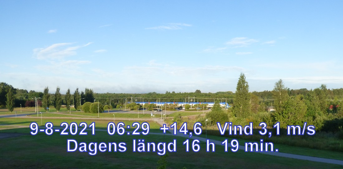 +14 °C Vind 10,0 m/s Mest klart och uppehåll Känns som+11° Fuktighet 74.2% Soluppgång 04:30 Solnedgång 21:21 Dagens längd 16 h 51 min.
