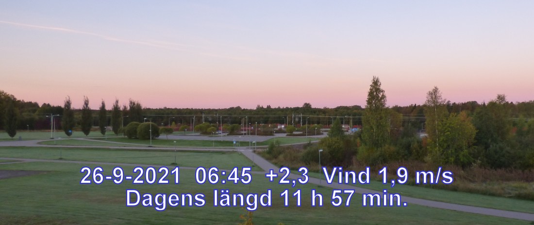 +9 °C Vind 1,9 m/s Klart och uppehållsväder Känns som +8° Daggpunkt +7° Fuktighet 88.4% Soluppgång 06:42 Solnedgång 18:39 Dagens längd 11 h 57 min.