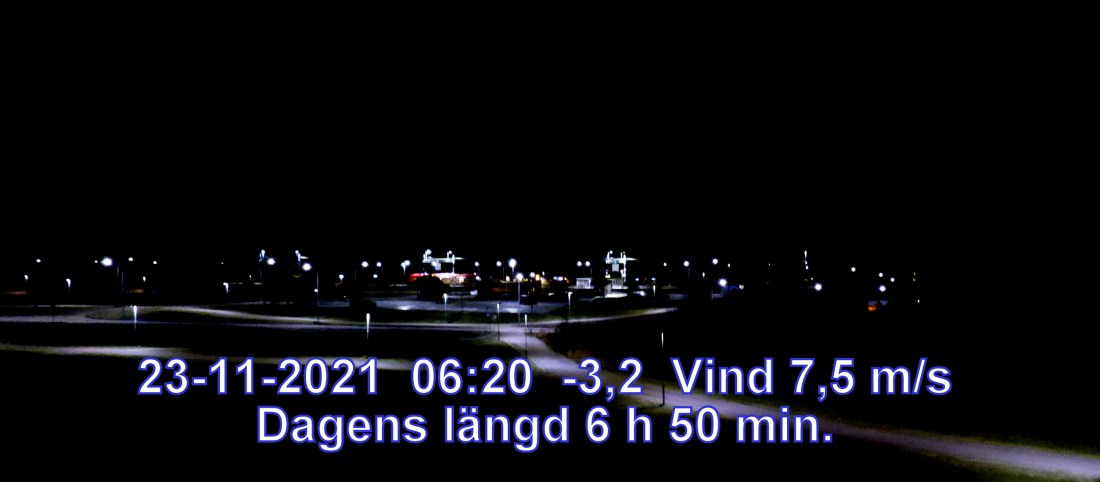 -3 °C Vind 9,3 m/s Molnigt och någon lätt snöby Känns som-10° Daggpunkt-4° Fuktighet 92.7% Soluppgång 08:27 Solnedgång 14:49 Dagens längd 6 h 22 min.