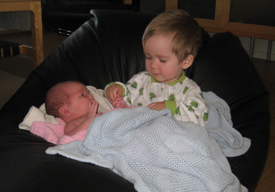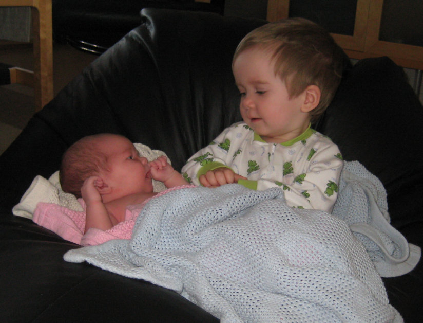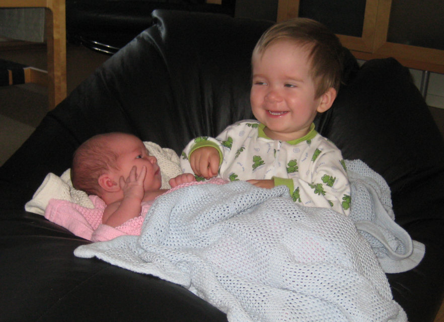 En mycket glad storebror (Loke) 2 år med lillasyster (Moa) 1 månad.2008.