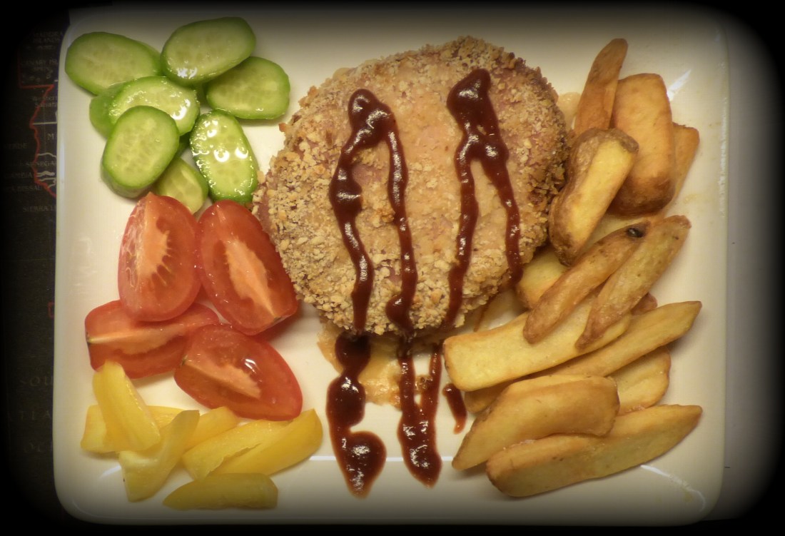 Börjar med dagens käk.Det blev kokt skinka,skivad med rökt skinka och mozzarella ost i mellan,pankopanerad,med stora pommes bbqsås och lite grönt.I glaset en röd från Italien.Zensa Nero dÁvola.Smakade utmärkt.