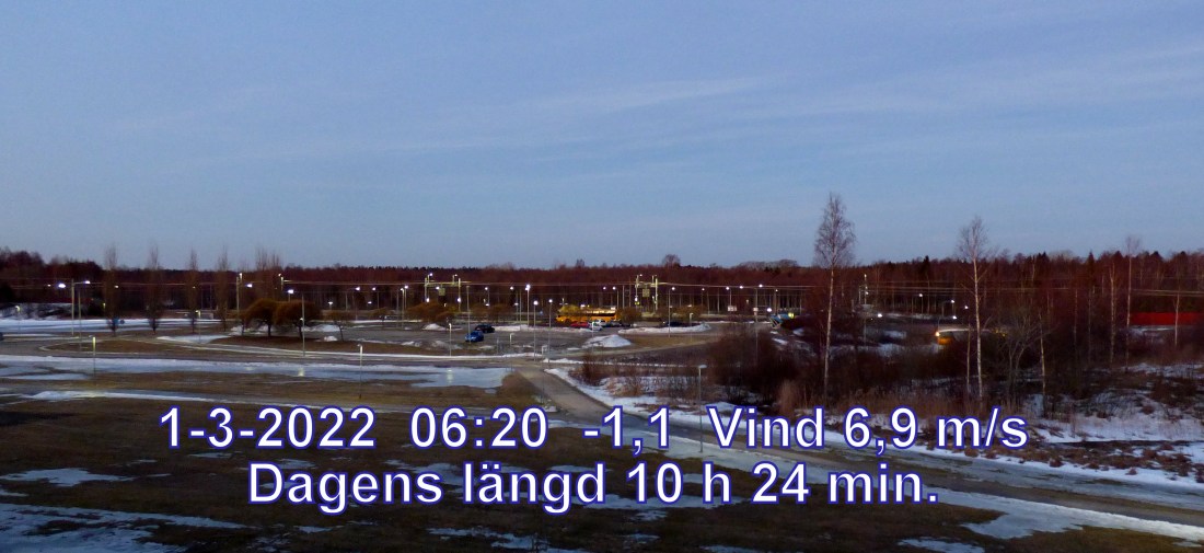 +0 °C Vind 6,9 m/s Mulet, men troligen uppehåll Känns som -6° Daggpunkt -4° Fuktighet 70.5% Soluppgång 06:51 Solnedgång 17:15 Dagens längd 10 h 24 min.