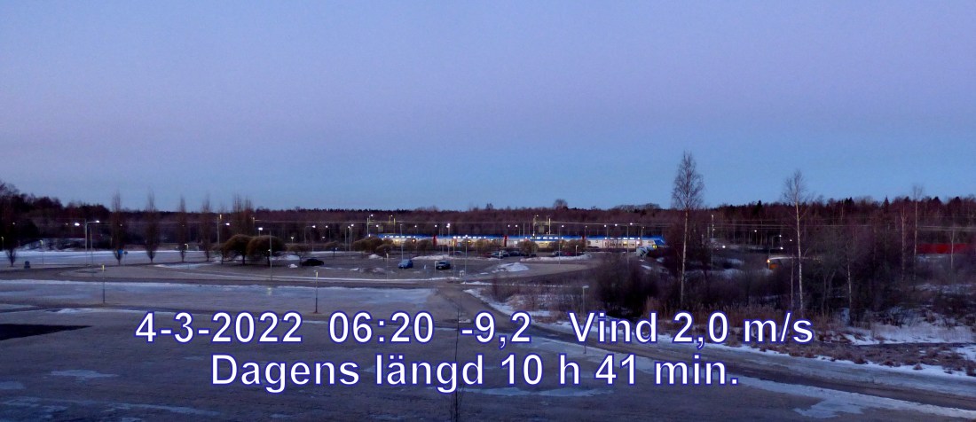 -3 °C Vind 2,0 m/s Klart och uppehållsväder Känns som -6° Daggpunkt -4° Fuktighet 88.1% Soluppgång 06:42 Solnedgång 17:23 Dagens längd 10 h 41 min.