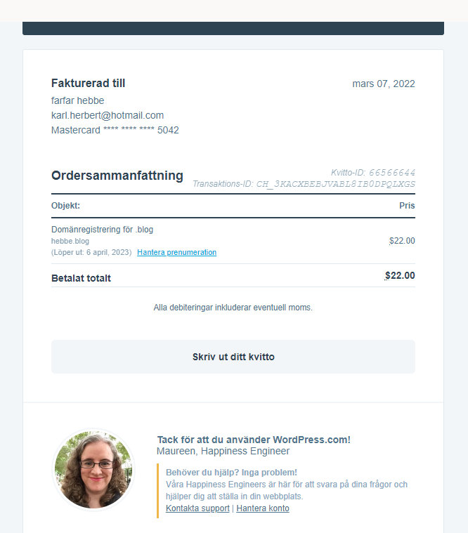 Fick kvitto från Word Press i morse att jag nu har betalat min domän för ett nytt år.Fram till 6 April 2023..