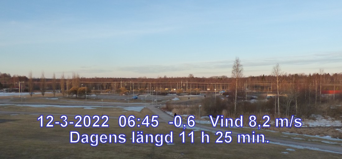 0 °C Vind 8,2 m/s Halvklart och uppehåll Känns som -7° Daggpunkt -3° Fuktighet 80.5% Soluppgång 06:18 Solnedgång 17:43 Dagens längd 11 h 25 min.