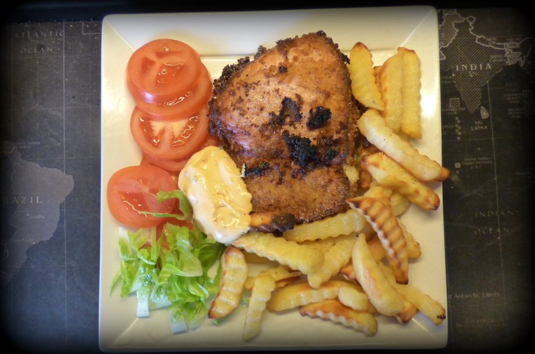 Jag köpte en färdigkokt liten skinka förra veckan.Den kan det bli något av,så jag skar 2 skivor på 1/2 cm tjocklek,lade lite Danablue ädelost mellan skivorna. Panerade i en blandning av vanligt ströbröd och panco.Sedan in i ugnen tillsammans med lite pommes..På tallriken blev det lite grönt och Chilibea.I glaset den goda Breznak ölen från Tjeckien..Smakade bra..