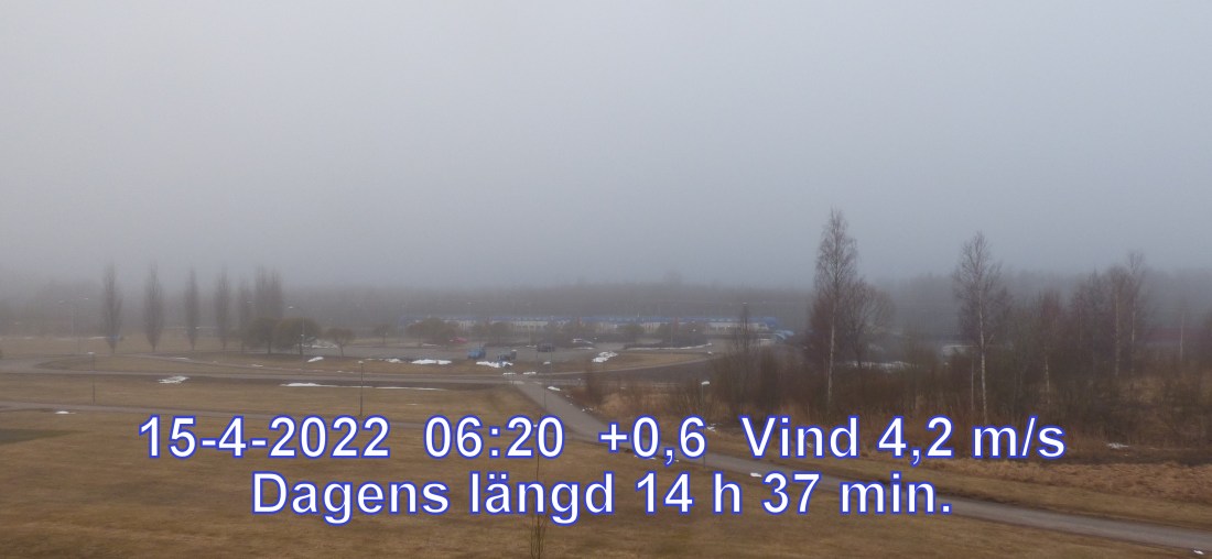 0 °C Vind 4,2 m/s Klart och uppehållsväder Känns som -5° Daggpunkt 0° Fuktighet 99.2% Soluppgång 05:32 Solnedgång 20:09 Dagens längd 14 h 37 min.