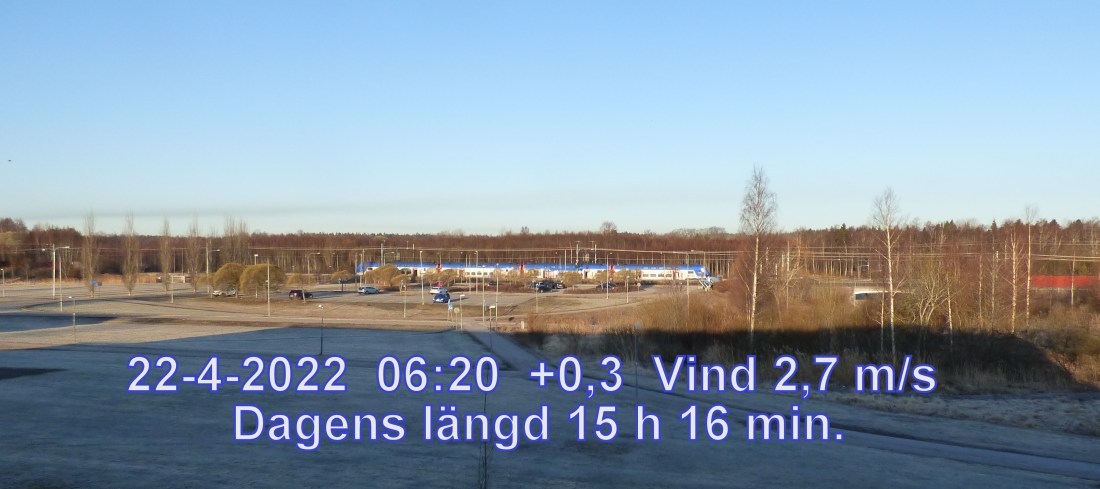 +4 °C Vind 2,7 m/s Klart och uppehållsväder Känns som +1° Daggpunkt +3° Fuktighet 93.2% Soluppgång 05:11 Solnedgång 20:27 Dagens längd 15 h 16 min.