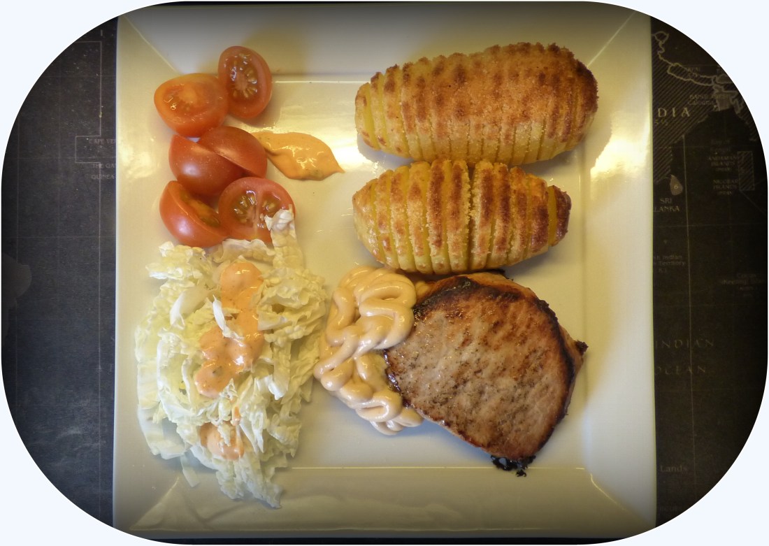 Fläskytter och hasselbackpotatis är ju en enkel anrättning,brynte på köttet snittade potatisen,den fick gå 15 min i ugnen.Tog ut formen penslade potatisen med lite olja strödde på lite ströbröd..Lade köttet i formen och in i ugnen igen i drygt 15 min.Förberedde tallriken med lite grönt,blev lite baconnaice sås till,, fixade ett glas rött,idag en röd från Australien..Rosemount Shiraz Cabernet, 2021.Smakade bra.