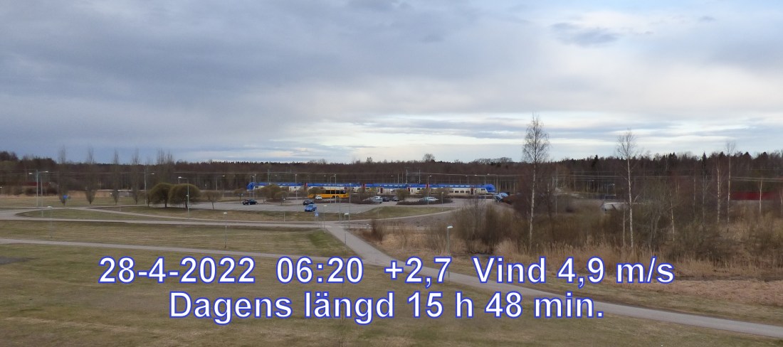 +2 °C Vind 4,9 m/s Halvklart och uppehåll Känns som -2° Daggpunkt -2° Fuktighet 75.3% Soluppgång 04:54 Solnedgång 20:42 Dagens längd 15 h 48 min.