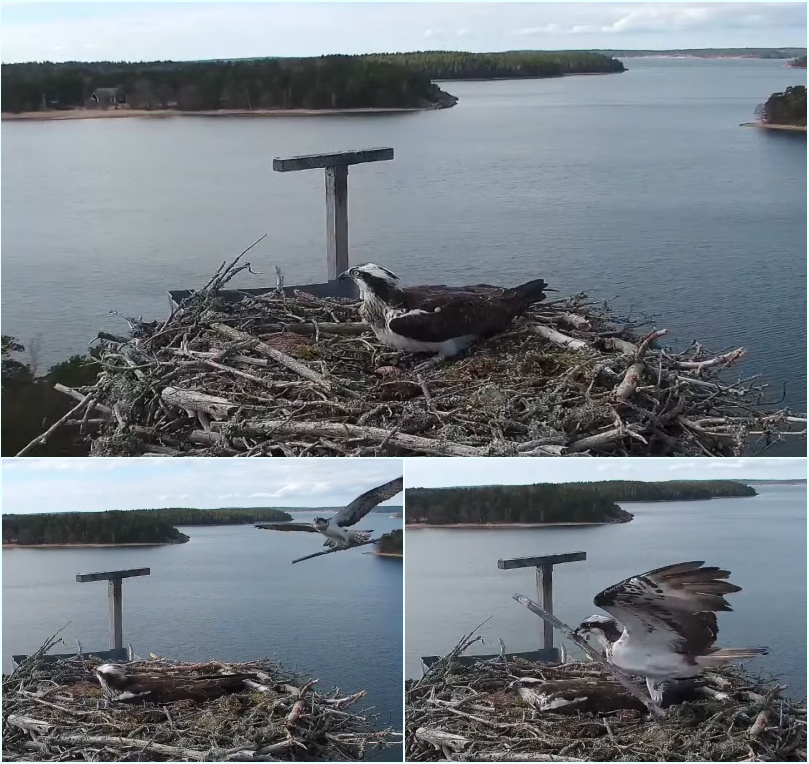 Ja jag bevakade boet under ganska lång tid,och till slut reste sig honan och bökade med näbben i boet,,och då fick jag se att där fanns ett ägg..Pappa Gjuse kom med en kraftig gren som ska hamna någonstans i boet..