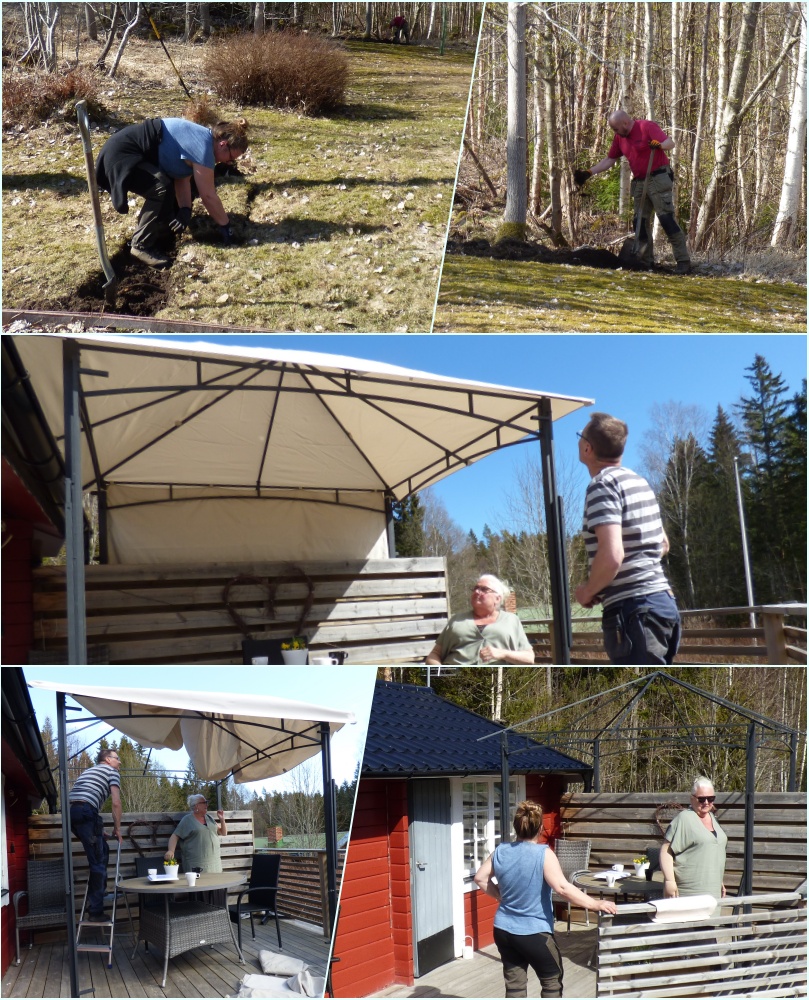 Verkar som det blir mindre eldande av brasor i år,detta på grund av att det är snustorrt i markerna..För mig blir det en hemmqakväll,ungdomarna får stå för utegalejet.Jag gjorde en tur till Eskön på förmiddagen,där var det aktiviteter både hos syster yster och systerdottern Lotta.Lotta och Tony var som grävlingar. Bibbi och Binge var montörer.Det skulle bli tak över uteplatsen..