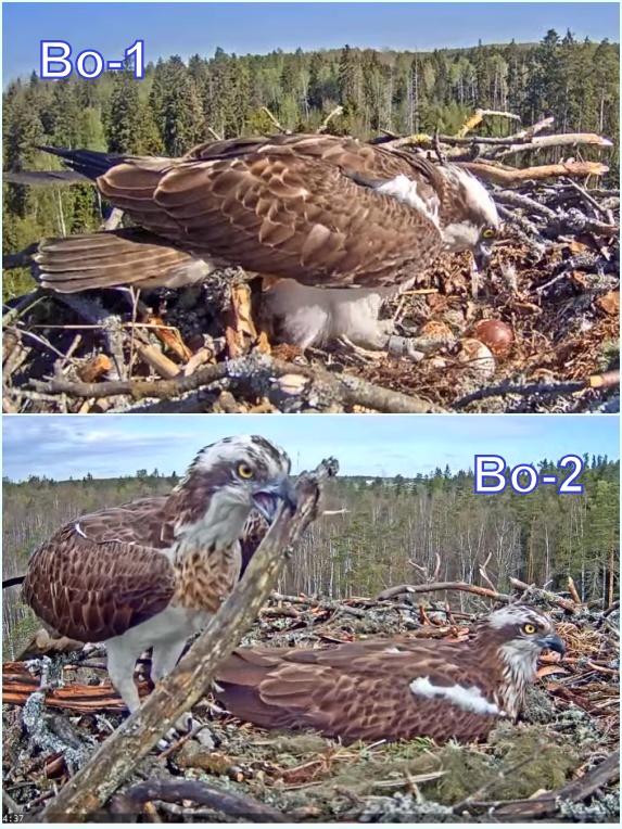Nu är det på gång i de båda Fiskgjusebona i Estland,det ligger 3 st ägg i båda.Mamma gjuse i bo 1 har precis luftat sina vingar en stund..I bo 2 så tycker pappa gjuse att det behövs möbleras om.