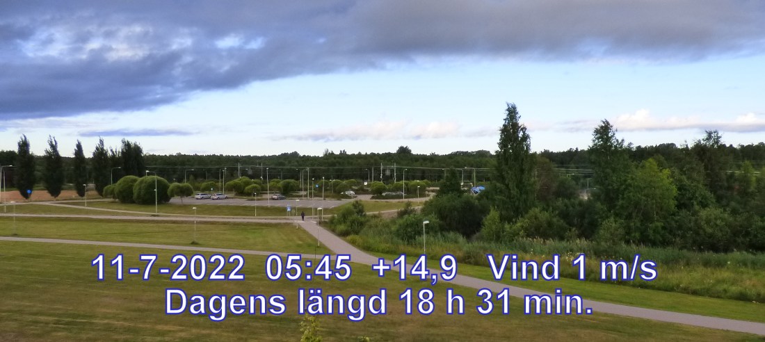 +11° C Vind 1 m/s Mest klart och uppehåll Känns som+11° Daggpunkt+10° Fuktighet 92 % Sikt 40000 m Soluppgång 03:39 Solnedgång 22:11 Dagens längd 18 h 31 min.