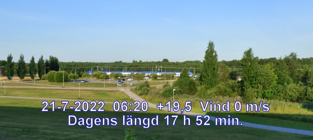 +14° C Vind 0 m/s Klart och uppehållsväder Sikt 19992 m Soluppgång 03:59 Solnedgång 21:52 Dagens längd 17 h 52 min.