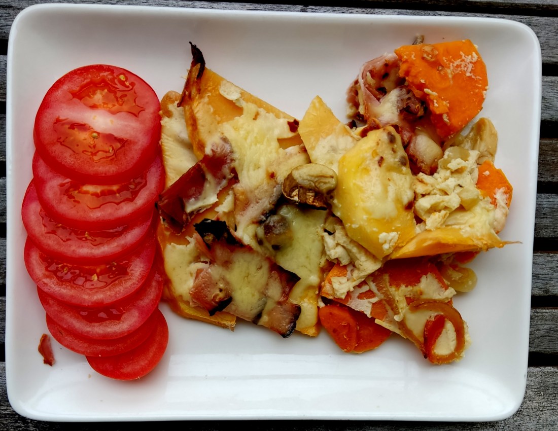 Dagens mat blev en mix av de rotsaker jag hade i skåpet,blev lite andra ingredienser å..Gul lök,Sötpotatis,Morot,Kålrot,Champinjoner,Rökt skinka,Creme fraice,Ägg,Salt,Peppar,Chiliflakes,Riven ost,Tomat.