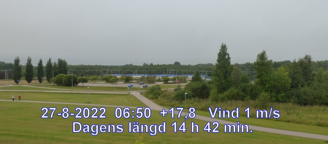 +7° C Vind 0 m/s Klart och uppehållsväder Känns som +7° Daggpunkt +6° Fuktighet 99 % Sikt 12733 m Soluppgång 05:25 Solnedgång 20:18 Dagens längd 14 h 53 min.