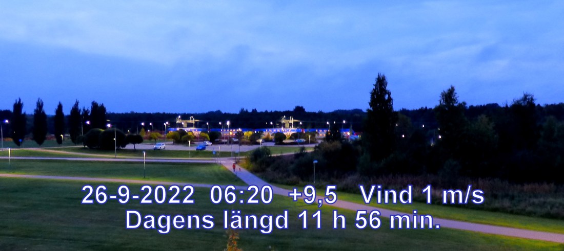 +9° C Vind 1 m/s Mulet, men troligen uppehåll Lufttryck 1001 hPa Sikt 17398 m Soluppgång 06:42 Solnedgång 18:39 Dagens längd 11 h 56 min.