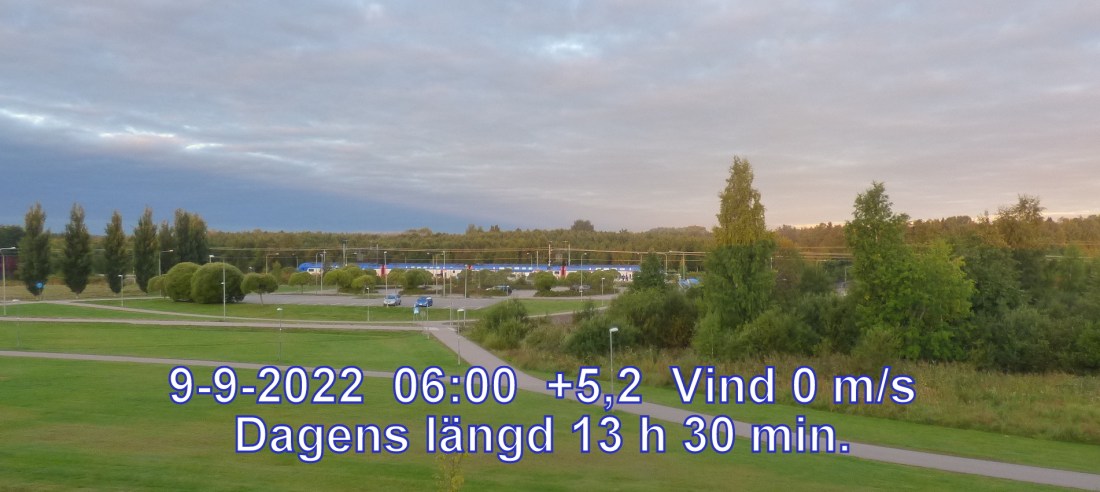 +12° C Vind 1 m/sMulet, men troligen uppehåll Lufttryck 1005 hPa Soluppgång 06:11 Solnedgång 19:19 Dagens längd 13 h 8 min.