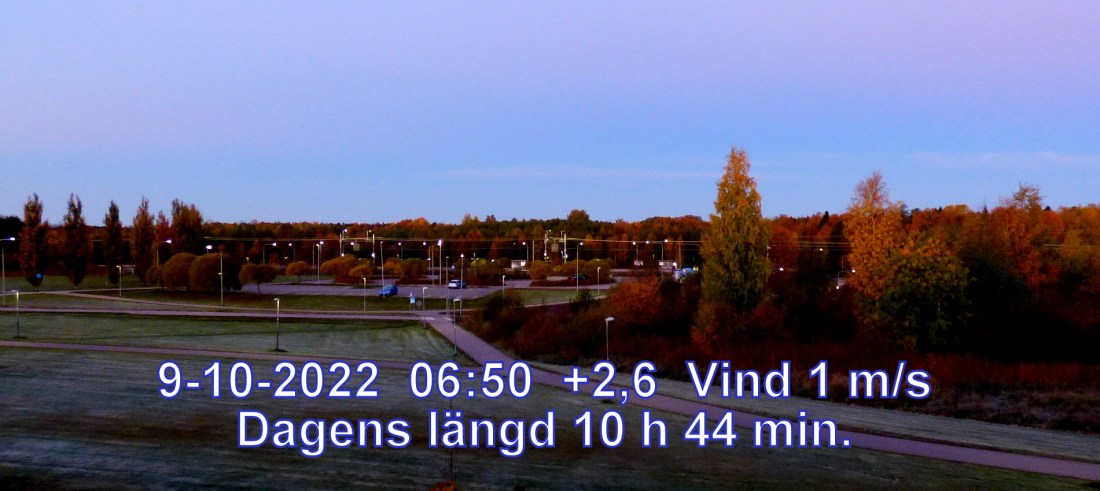 +1° C Vind 1 m/s Klart och uppehållsväder Lufttryck 1013 hPa Soluppgång 07:14 Solnedgång 17:59 Dagens längd 10 h 44 min.