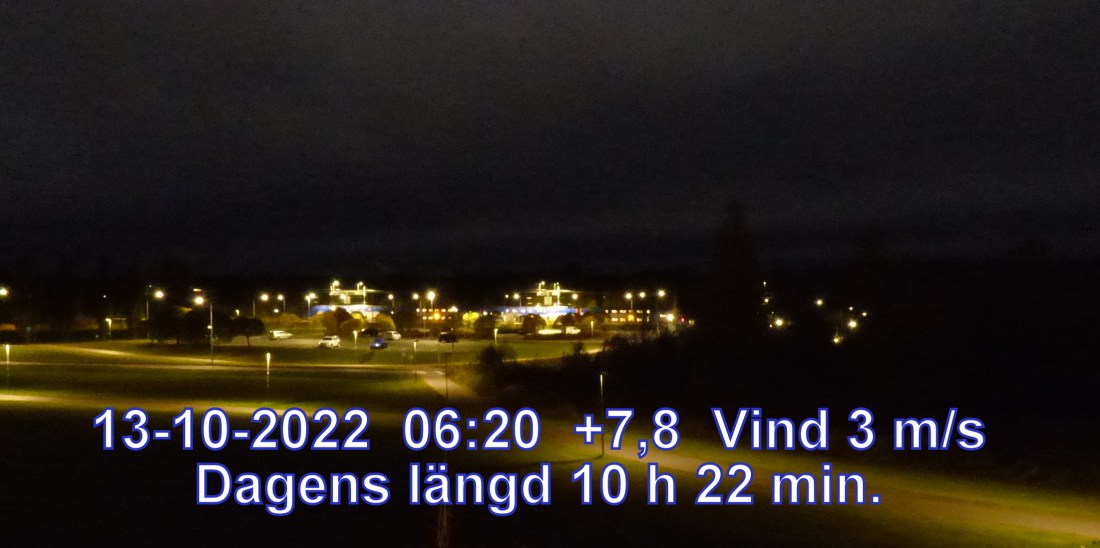 +6° C Vind 3 m/s Mulet, men troligen uppehåll Lufttryck 1016 hPa Sikt 27078 m Soluppgång 07:24 Solnedgång 17:47 Dagens längd 10 h 22 min.