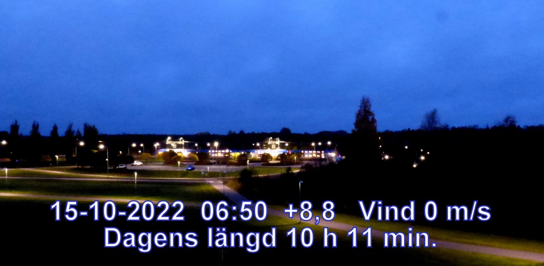 +8° C Vind 0 m/s Mulet, men troligen uppehåll Lufttryck 1005 hPa Soluppgång 07:29 Solnedgång 17:41 Dagens längd 10 h 11 min.