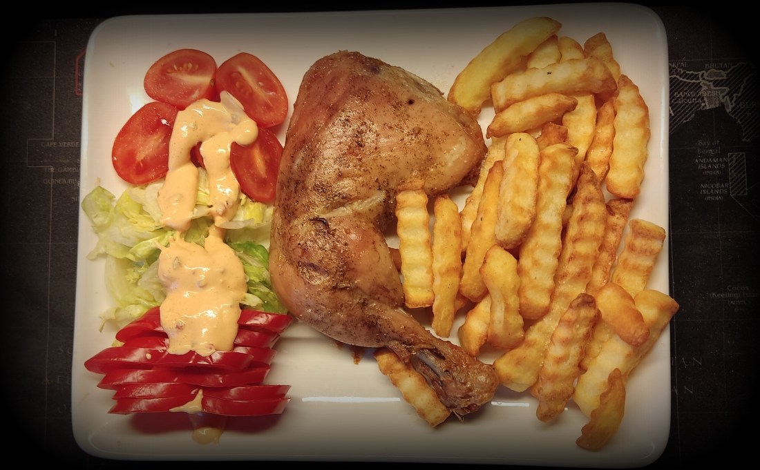 Kycklingklubba i ugn med pommes och lite grönt,smakade bra,i glaset helt vanligt vatten med lite citron i..Även det funkade bra..