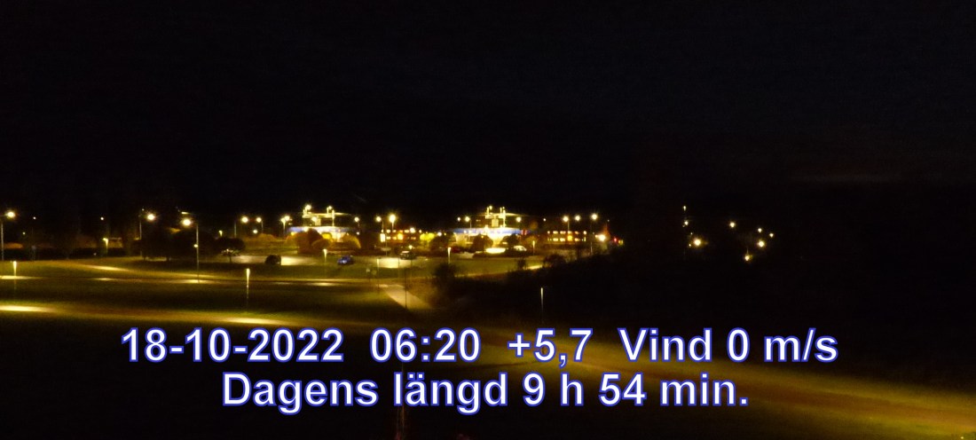+6° C Vind 0 m/s Mulet, men troligen uppehåll Lufttryck 1013 hPa Sikt 50000 m Soluppgång 07:37 Solnedgång 17:32 Dagens längd 9 h 54 min.